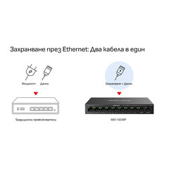 - Два кабела в един: С 8 PoE+ порта, прехвърля данни и захранване по един единствен кабел