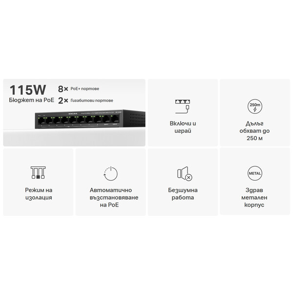 - 10 порта: 8× 10/100 Mbps PoE+ портове + 2× Gigabit non-PoE портове