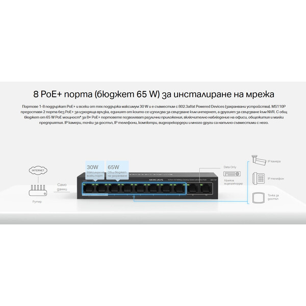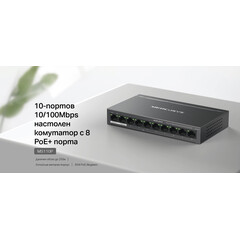 • 10-портов 10/100Mbps настолен комутатор с 8 PoE+ порта (MS110P)
