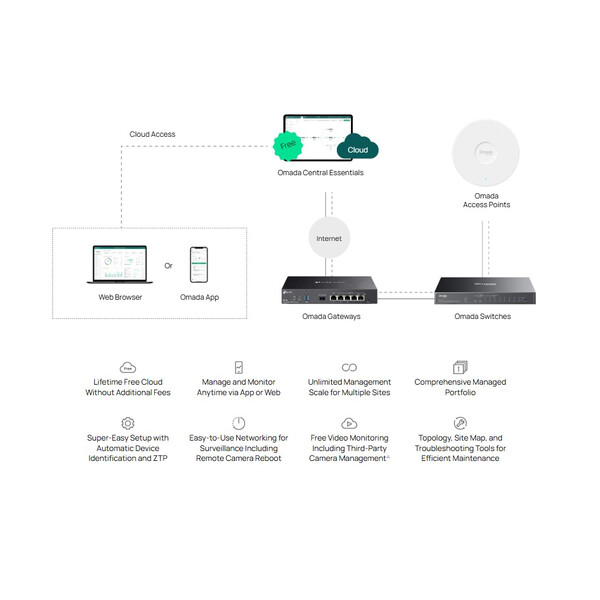 Той осигурява облачно базирано централизирано управление и мониторинг за мрежовата система Omada, обхващаща точки за достъп, комутатори и шлюзове, идеален за мрежи за видеонаблюдение и малки предприятия.