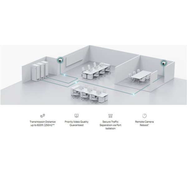 • До 820 фута PoE**, дистанционно рестартиране на камерата†, QoS и изолация на портове за надеждна мрежа за видеонаблюдение