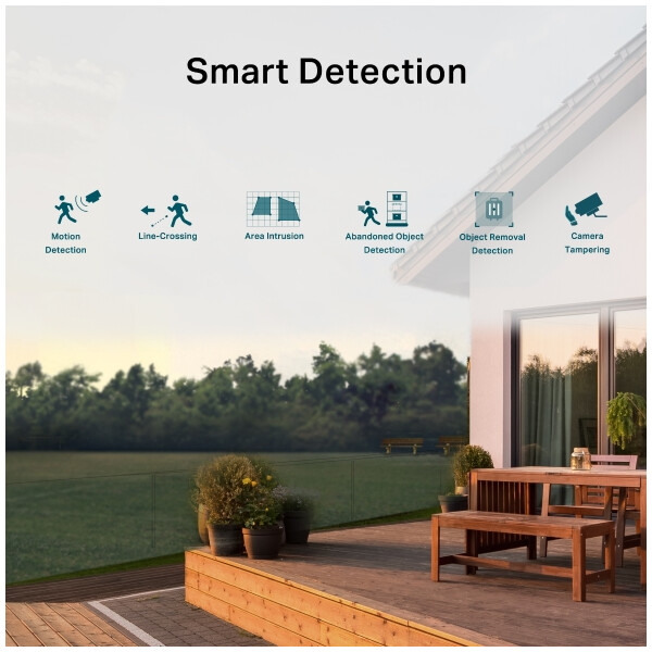 - Интелигентно откриване: Получавайте известия и проверявайте емисии, когато някой пресече граница, навлезе в зона, която сте задали, пречи на камерата или премахне/изостави обекти.