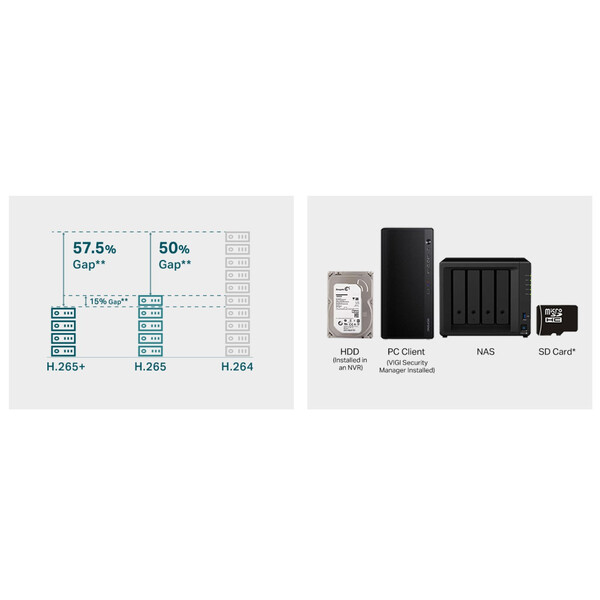 • H.265+: Без да използват допълнителна честотна лента, вашите камери предават компресирано кристално чисто видео, за да спестят дисково пространство, да улеснят натоварването на мрежата и да намалят разходите за наблюдение, без да жертват качеството на изображението.