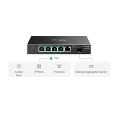 5× гигабитови порта (4× PoE+), 1× SFP слот