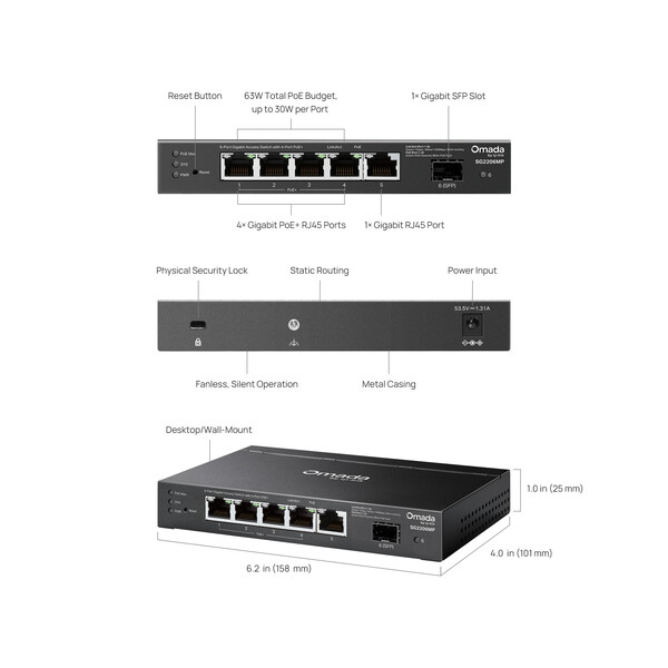 6-портов гигабитов комутатор за достъп с 4 PoE+ порта TP-Link Omada SG2206MP