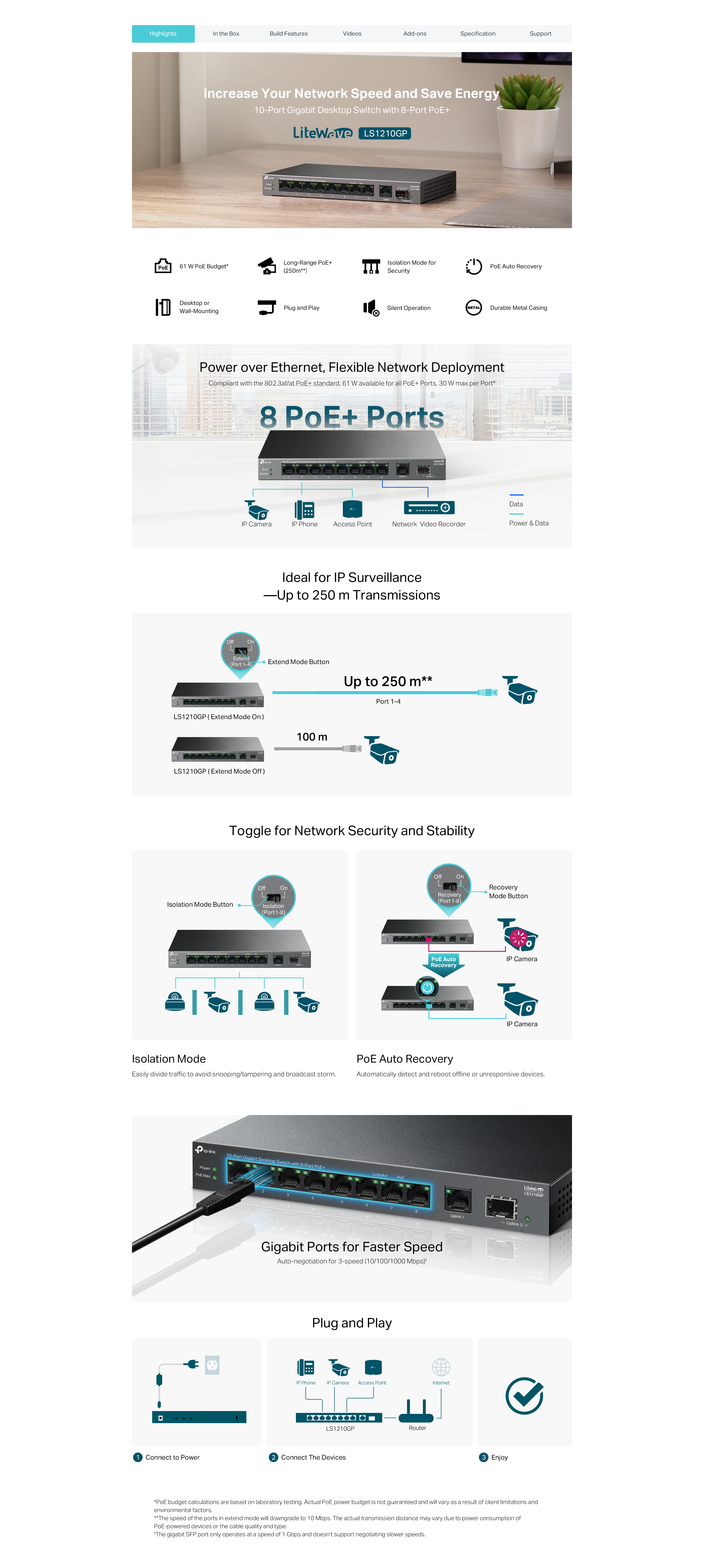 LS1210P е 8-портов 10/100Mbps + 2-портов гигабитов настолен комутатор с 8 порта, поддържащи PoE+ стандарт. Той предлага лесен начин за разширяване на кабелна мрежа чрез прехвърляне на захранване и данни през един Ethernet кабел. Осигурява общ енергиен бюджет от 96 W*, с до 30 W на порт. Поддържа обхват на предаване на данни и захранване до 250 м (820 фута) в режим Extend Mode** и е оборудван с режим на изолация и PoE Auto Recovery, което го прави идеален за сценарии за видеонаблюдение.