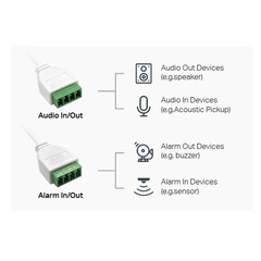 Аудио вход/изход и алармен вход/изход позволяват лесна интеграция с външни алармени или системи за контрол на достъпа.