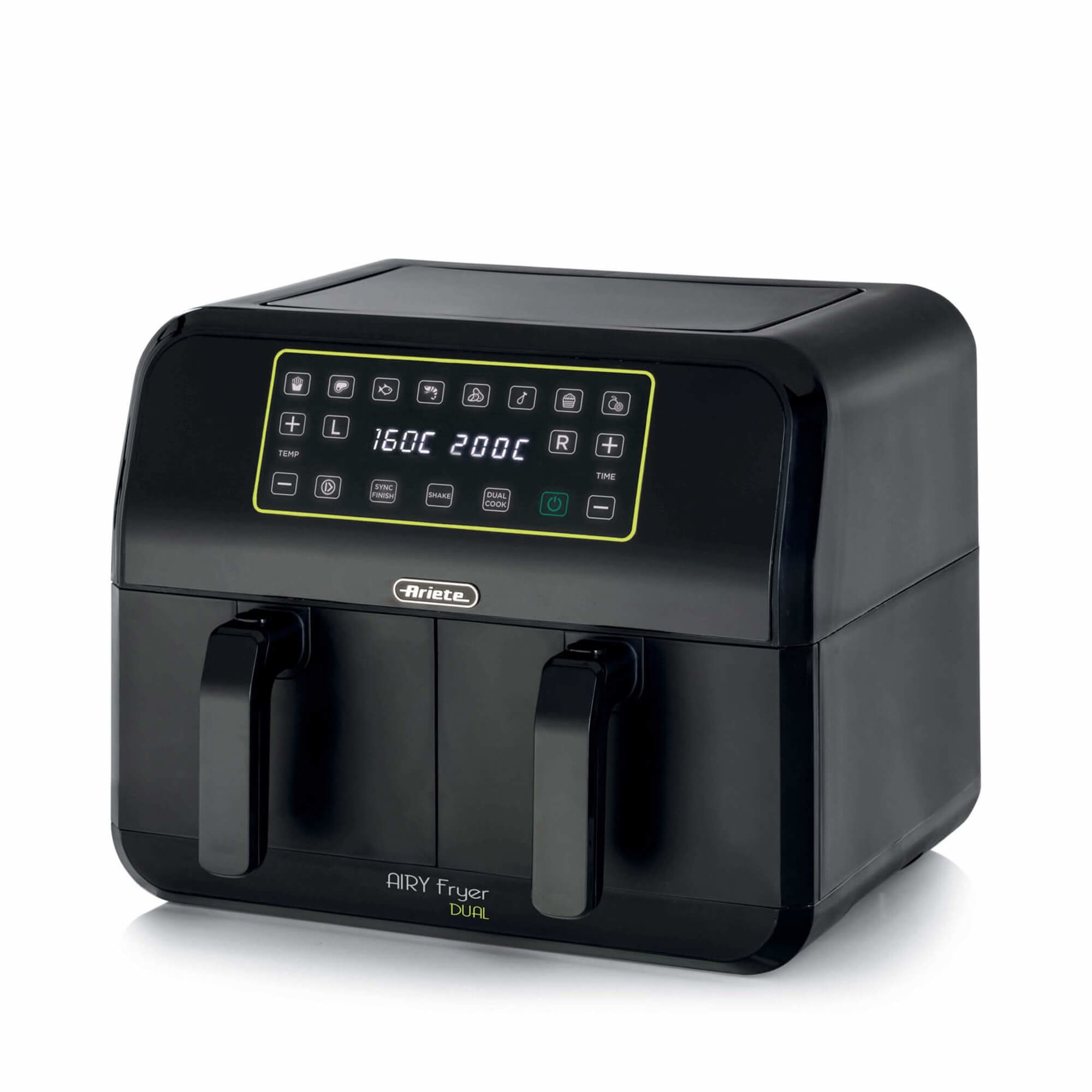 Ariete 4623/00. Тип на продукта: Фритюрник с горещ въздух, Вместимост: 8 Д, Вместимост на кошницата: 3,4 кг. Конструкция: Двойна, Цвят на продукта: Черен, Тип управление: Докосване. Тип дисплей: LED. Мощност: 1700 W. Ширина: 315 мм, Дълбочина: 385 мм, Височина: 355 мм