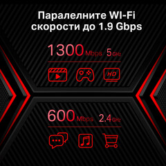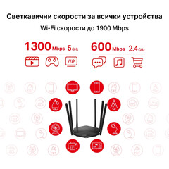 • AC1900 Dual Band скорости - Насладете се на домашно забавление без никакво забавяне, достигайки скорост до 1900 Mbps (1300 Mbps в честотната лента от 5 GHz и 600 Mbps в тази от 2,4 GHz)