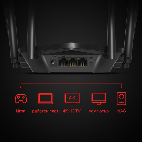 • Разширено покритие - 6-те  High Gain антени с Beamforming предлагат стабилни връзки в целия дом, за да осигурят силен WiFi сигнал във всеки ъгъл
