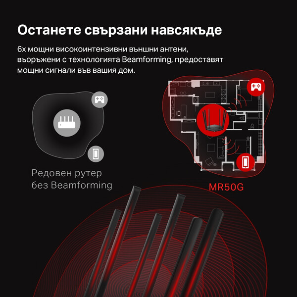 • По-висока ефективност на мрежата - технологията MU-MIMO  позволява MR50G да комуникира с няколко устройства едновременно, увеличавайки общата пропускателна способност на мрежата