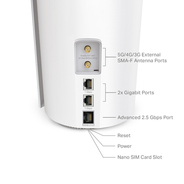 Освен това два порта за външна антена позволяват достъп до външна антена, която може да приема 5G/4G сигнали по-ефективно, което води до подобрена 5G/4G производителност.