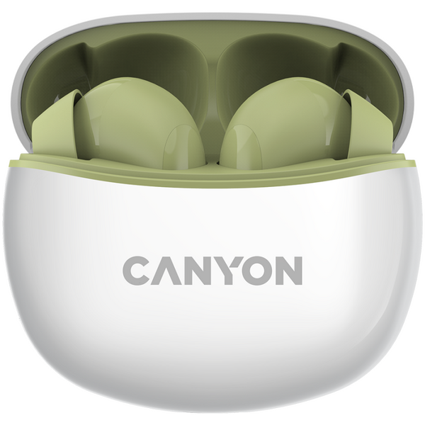 Canyon TWS-5 Bluetooth headset, with microphone, BT V5.3 JL 6983D4, Frequence Response:20Hz-20kHz, battery EarBud 40mAh*2+Charging Case 500mAh, type-C cable length 0.24m, Size: 58.5*52.91*25.5mm, 0.036kg, Green