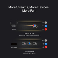 - ПОВЕЧЕ УСТРОЙСТВА, ПОВЕЧЕ ЗАБАВЛЕНИЕ – Поддържа MU-MIMO и OFDMA за намаляване на претоварването и учетворяване на средната пропускателна способност.