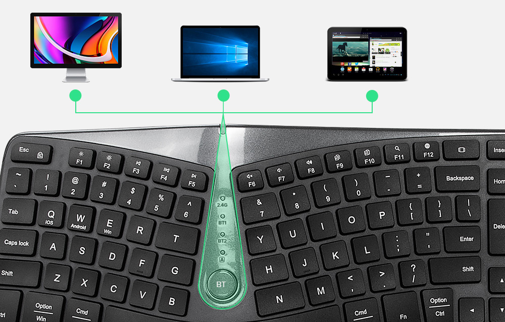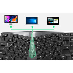 Прекарвате ли много време пред компютъра? Погрижете се за вашето здраве и комфорт! Безжичната клавиатура Delux GM901D се отличава с ергономичен дизайн за несравним комфорт. Оборудвана е със 107 клавиша и специална опора за дланта. Можете да я свържете с до 3 устройства чрез Bluetooth 3.0, Bluetooth 5.0 и в 2.4G обхвата. Има и практични функционални клавиши.