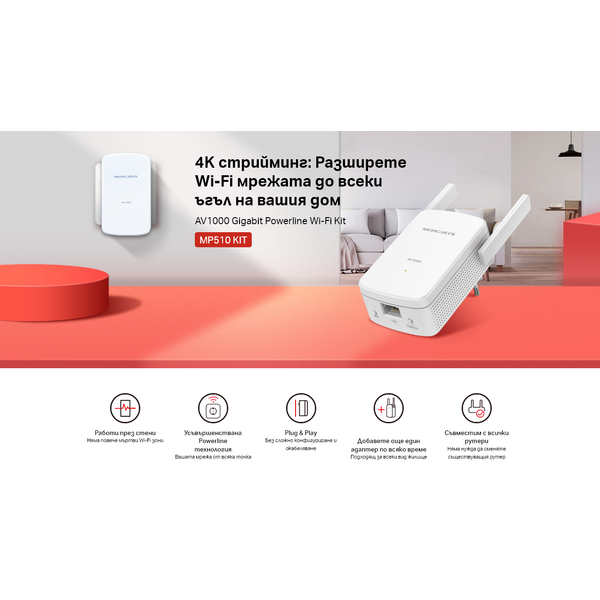 Гигабитен Powerline Адаптер WiFi Kit Mercusys MP510 KIT AV1000