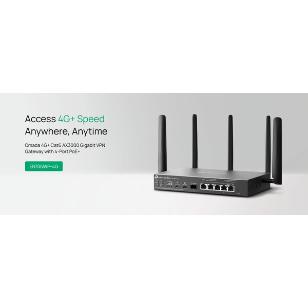 Гигабитен VPN рутер TP-Link Omada 4G+ Cat6 ER706WP-4G AX3000 4-портов PoE+