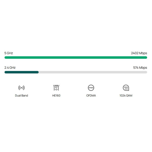 - AX3000 двулентов WiFi 6: Поддържа 2402 Mbps при 5 GHz и 574 Mbps при 2.4 GHz.