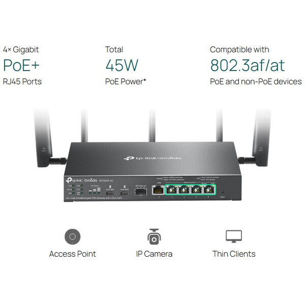 Съчетава 4G интернет достъп, Wi-Fi 6 безжична технология и 4 Gigabit PoE+ изходни порта в едно устройство.