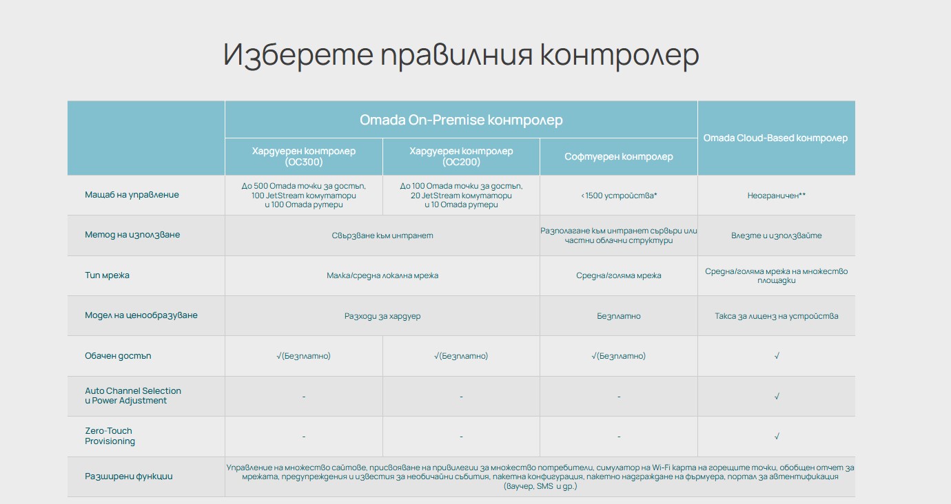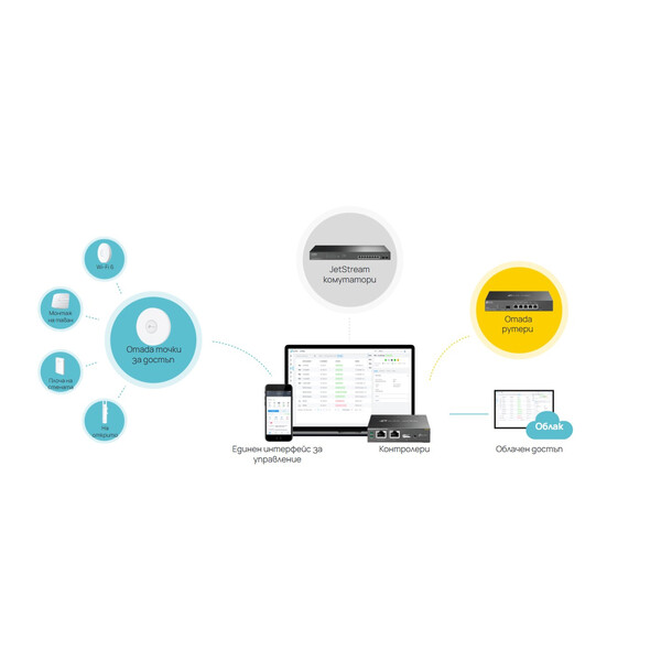 - Централизирано управление: До 100 Omada точки за достъп, 20 JetStream комутатора и 10 Omada рутера.