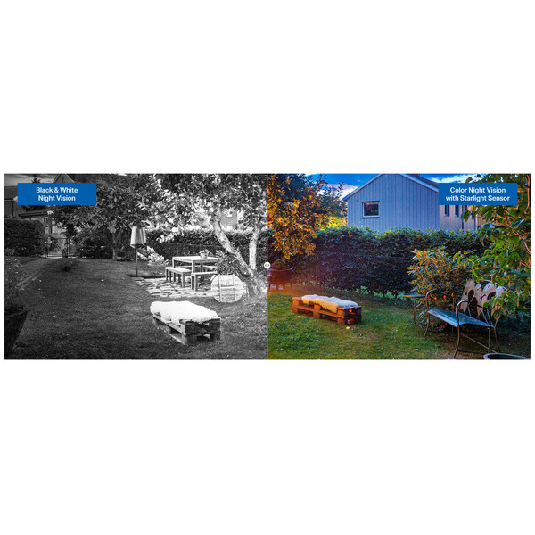 - Цветно нощно виждане: Подобрява вашата сигурност, като разкрива по-ярки, пълноцветни изображения и ярки детайли дори при условия на слаба светлина с вградени прожектори и сензор за звездна светлина.