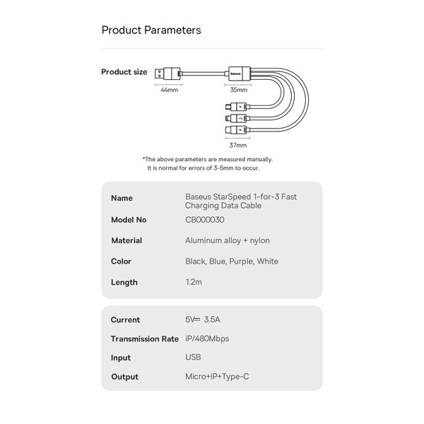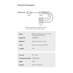 Кабел Baseus StarSpeed USB към M+L+C 3.5A Fast Charging 1.2м - бял