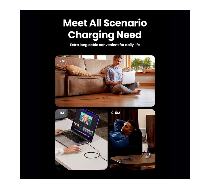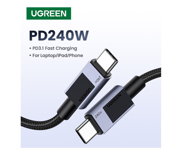 С вграден E-Marker чип, кабелът UGREEN USB-C към USB-C поддържа бързо зареждане до 240W чрез технологии PD3.1 / PPS, осигуряващи ток до 48V / 5A. Съвместим е с различни нива на Power Delivery: 240W, 100W, 87W, 61W, 45W, 30W и 18W, за бързо и безопасно зареждане на всички USB-C устройства.