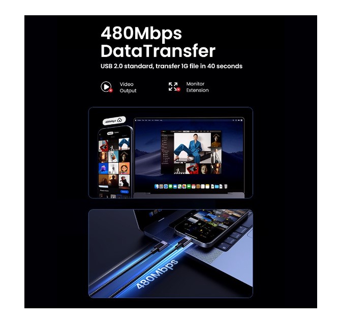 Съвместим със стандарта USB 2.0, кабелът осигурява скорост на трансфер до 480Mbps, което позволява прехвърляне на 1GB файл за около 30 секунди.