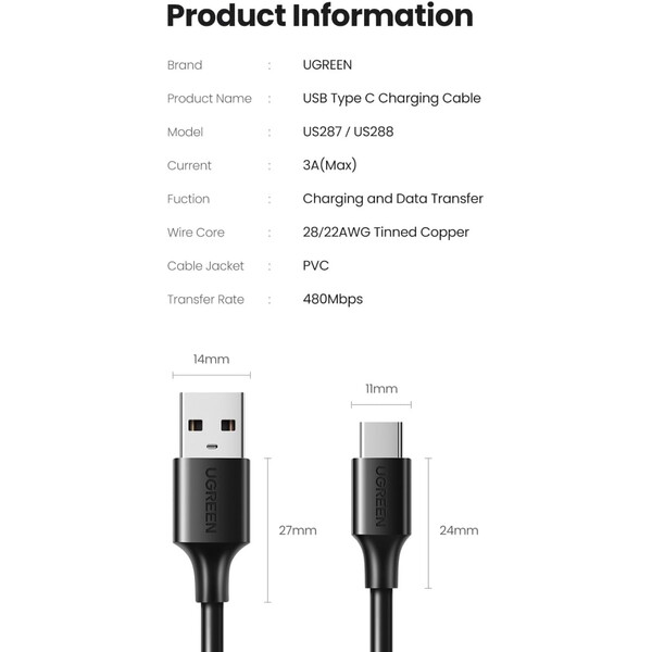 Ugreen US287 (60116) е изключително издръжлив USB кабел, предназначен за надеждно захранване и бърз трансфер на данни. Кабелът е с конектори USB-A към USB-C и поддържа ток до 3A. Изработен е от висококачествена гъвкава пластмаса, осигуряваща дълъг живот и устойчивост.