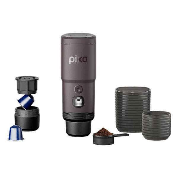 Wacaco Minipresso Pixapresso. Цвят на продукта: Черен, Неръждаема стомана, Вид на кафето: Смляно кафе и капсули, Максимално работно налягане: 20 бар. Капацитет 120 мл, Капацитет батерия: 9000 mAh, Размер: 75 Х 75 Х 190 мм; Тегло: 755 г