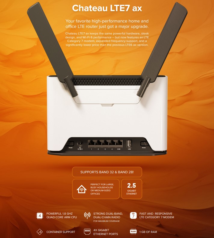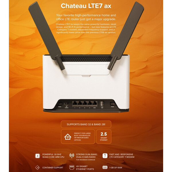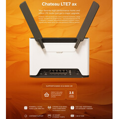 Chateau LTE7 ax комбинира новия R11e-LTE7 modem с четириядрен ARM процесор, 1GB RAM, Wi-Fi 6 (802.11ax) dual-band wireless и 2.5 Gigabit Ethernet порт за изключително бързи локални връзки.