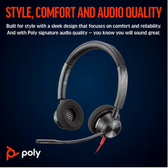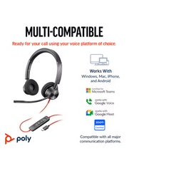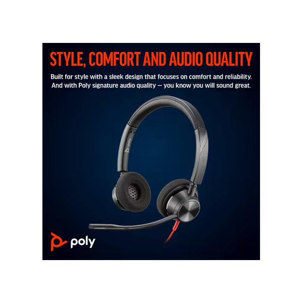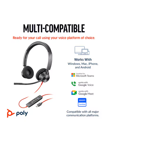 HP Poly Blackwire 3320 Стерео Слушалки са универсални и висококачествени слушалки, предназначени за професионална употреба, особено за Microsoft Teams. Ето техните основни характеристики и спецификации: