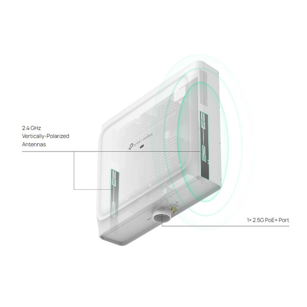 EAP772-Outdoor разполага с 1×2.5G PoE+ RJ45 порт, осигуряващ висока пропускателна способност за приложения като плавен стрийминг на живо и 4K видео. Освен това неговите двойно поляризирани антени в 2,4 GHz обхват предлагат по-добра способност срещу смущения.