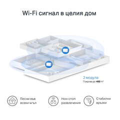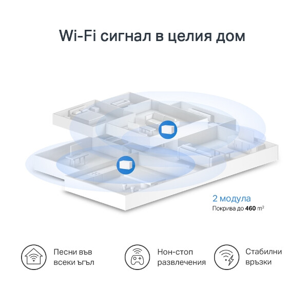 - Покритие за цялата къща—Покрива до 460 m² (пакет от 2 модула), осигурявайки Wi-Fi сигнал дори в най-отдалечените ъгли на дома.