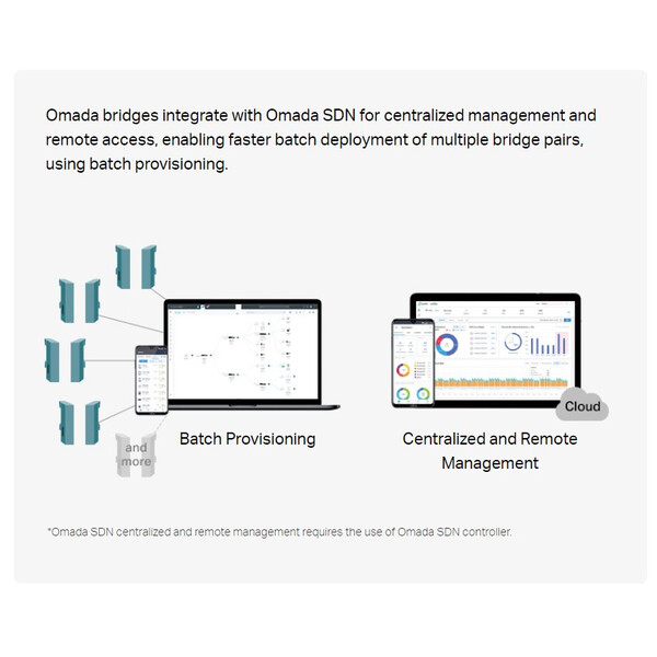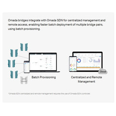 Мостовете на Omada се интегрират с Omada SDN за централизирано управление и отдалечен достъп, позволявайки по-бързо групово внедряване на множество двойки мостове, използвайки пакетно осигуряване.