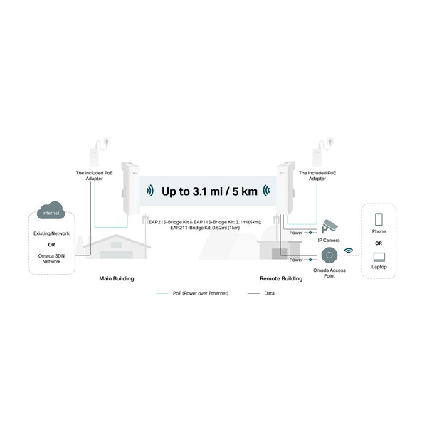 Осигурете честотна лента от 550 Mbps в обхват от 328 фута (100 м), като използвате EAP215-Bridge KIT или EAP211-Bridge KIT.