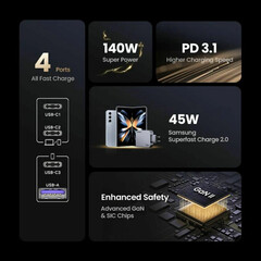 Портове: 3 × USB-C + 1 × USB-A – зареждане на до 4 устройства едновременно