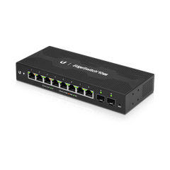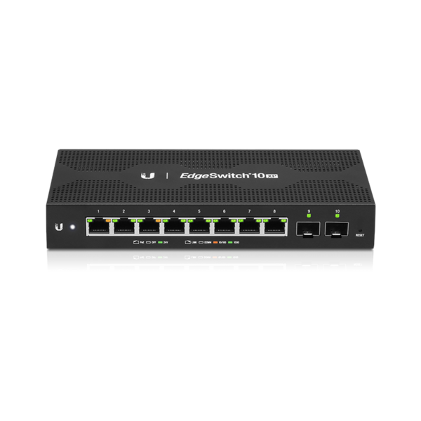 Optimized for WISP deployments, the EdgeSwitch® 10XP is a managed PoE switch with SFP ports. Eight Gigabit RJ45 ports offer copper connectivity with 24V PoE output, while two SFP ports offer fiber connectivity. The browser-based configuration interface offers intuitive control using a redesigned UI. Management is also available through the Ubiquiti® Network Management System (UNMS).