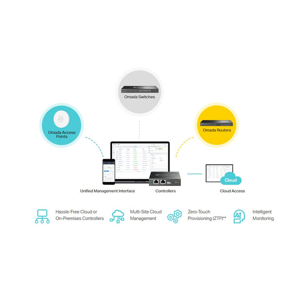 - Integrated into Omada SDN: Zero-Touch Provisioning (ZTP), Centralized Cloud Management, and Intelligent Monitoring.
