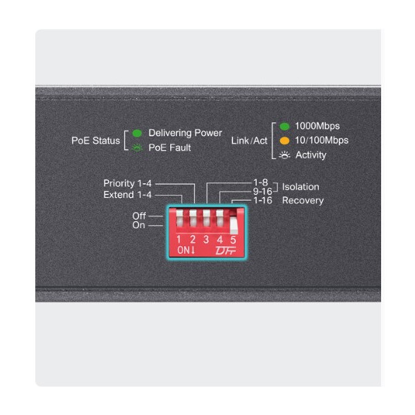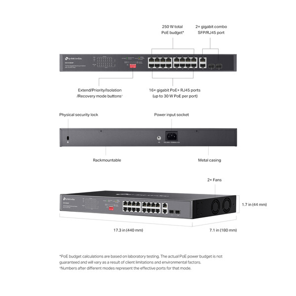 - 16× Gigabit PoE+ RJ45 ports and 2× Combo Gigabit SFP slots