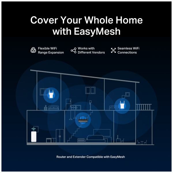 EasyMesh Compatible: Works with EasyMesh routers and range extenders to form a seamless Mesh WiFi throughout your home, preventing drops and delays when switching between signals.