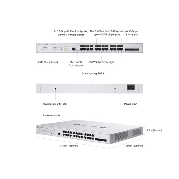 Build and expand your lightning-fast network with Omada Pro S5500-24MPP4XF—a full enterprise-level managed switch with 8× 2.5 Gbps PoE++, 16× 2.5 Gbps PoE+ ports, and 4× 10G SFP+ ports. Users can supply up to 500 W total power to connected devices and flexibly deploy equipment such as wireless access points or IP cameras without worrying about power outlets. PoE support together with high-performance static routing, enterprise-level QoS, advanced security features, a selection of Layer 2 management options, and integration into Omada Pro SDN (Software-Defined Networking) make S5500-24MPP4XF a great choice for enterprises, MDUs, hotels, and ISPs.