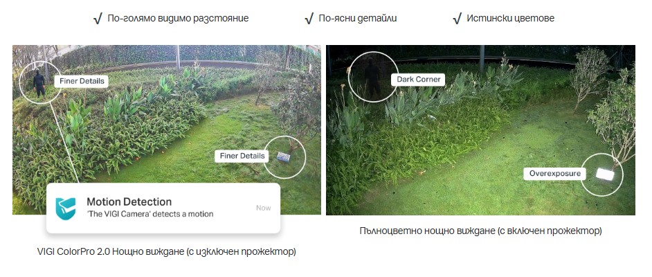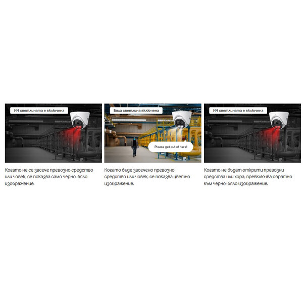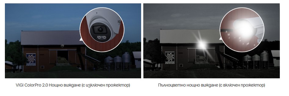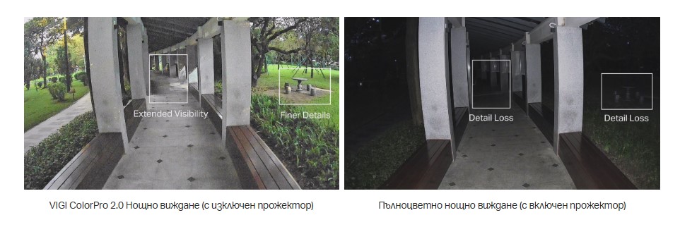 В пълен мрак с нулева осветеност, интелигентните инфрачервени бели светлини на VIGI автоматично ще активират бели светлини при откриване на хора или превозни средства, осигурявайки наситено цветно изображение, като същевременно възпират натрапници.