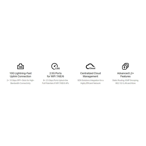 - 2.5 Gbps Speeds: 8× 2.5 Gbps RJ45 ports offer high-speed and reliable connections to other switches and devices.