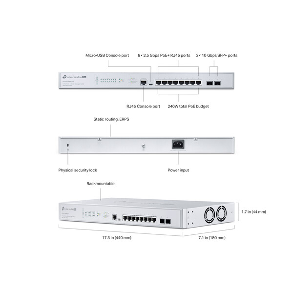 - 8× 2.5 Gbps 802.3at/af-compliant PoE+ ports