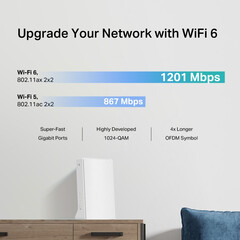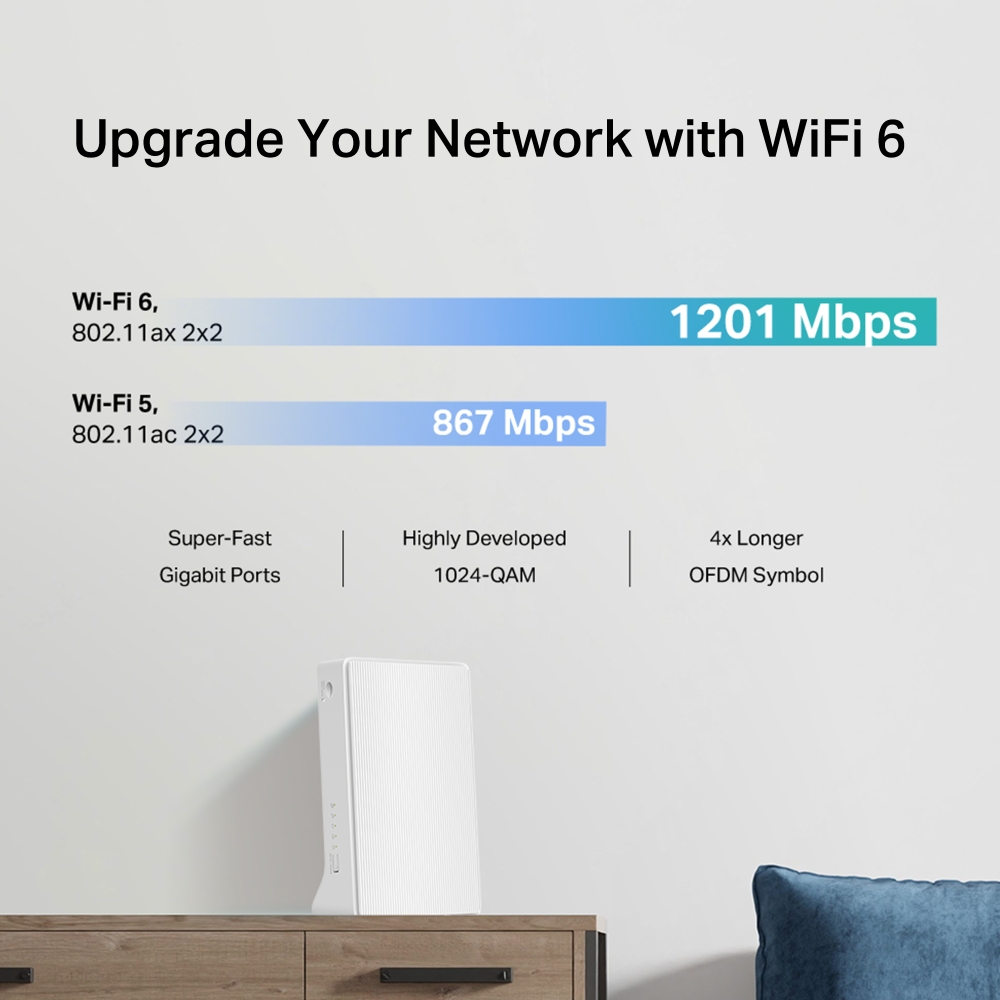 - Fast WiFi 6 – Speeds up to 300 Mbps on the 2.4 GHz band and 1201 Mbps on the 5 GHz band.