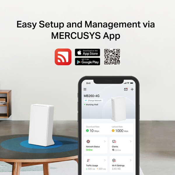 Set up and manage your WiFi via the MERCUSYS app from your smartphone (Android, iOS).