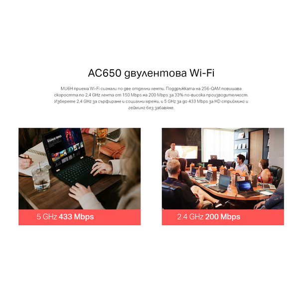 - Високоскоростна, двулентова Wi-Fi: поддръжката на 256-QAM повишава скоростта по 2,4 GHz лента от 150 Mbps на 200 Mbps. Наслаждавайте се на скорости до 200 Mbps по 2,4 GHz лента и 433 Mbps по 5 GHz лента, за да възползвате пълно от вашата AC Wi-Fi мрежа.