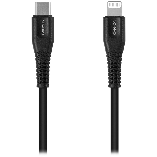 CANYON MFI-4 Type C Cable To MFI Lightning for Apple, PVC Mouling,Function:with full feature( data transmission and PD charging) Output:5V/2.4A , OD:3.5mm, cable length 1.2m, 0.026kg,Color:Black