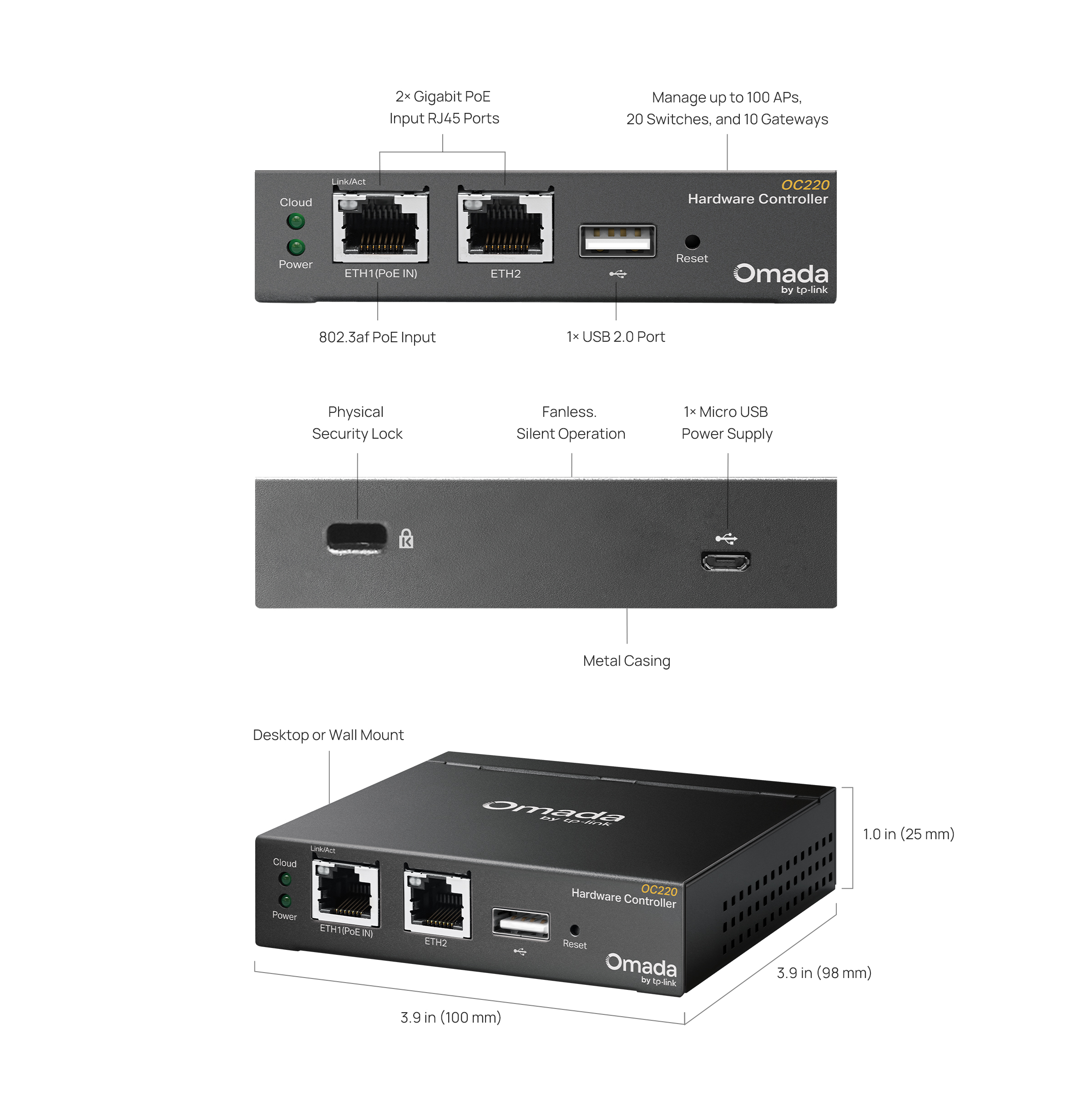 - Flexible Deployment: Powerd via 802.3af PoE or Micro USB (DC 5V/Minimum 1A) with a compact desktop or wall mount installation.